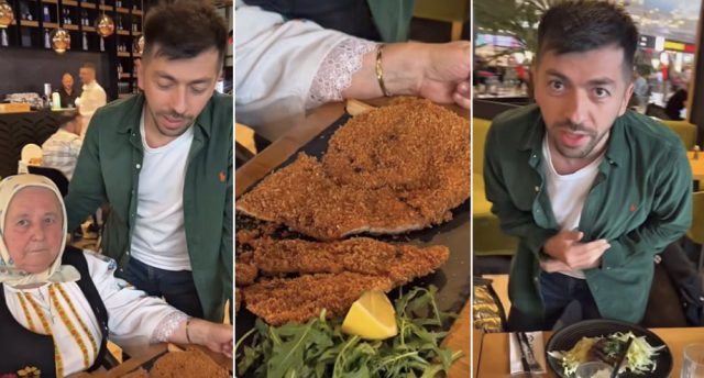 Se pare că tanti Lenuța a vrut ceva pe măsură — un șnițel cât farfuria! Mircea Bravo a luat carne cu ceva salată, ”niște buruiene”, a glumit Mircea Bravo, arătând preparatele spectaculoase servite la masă.